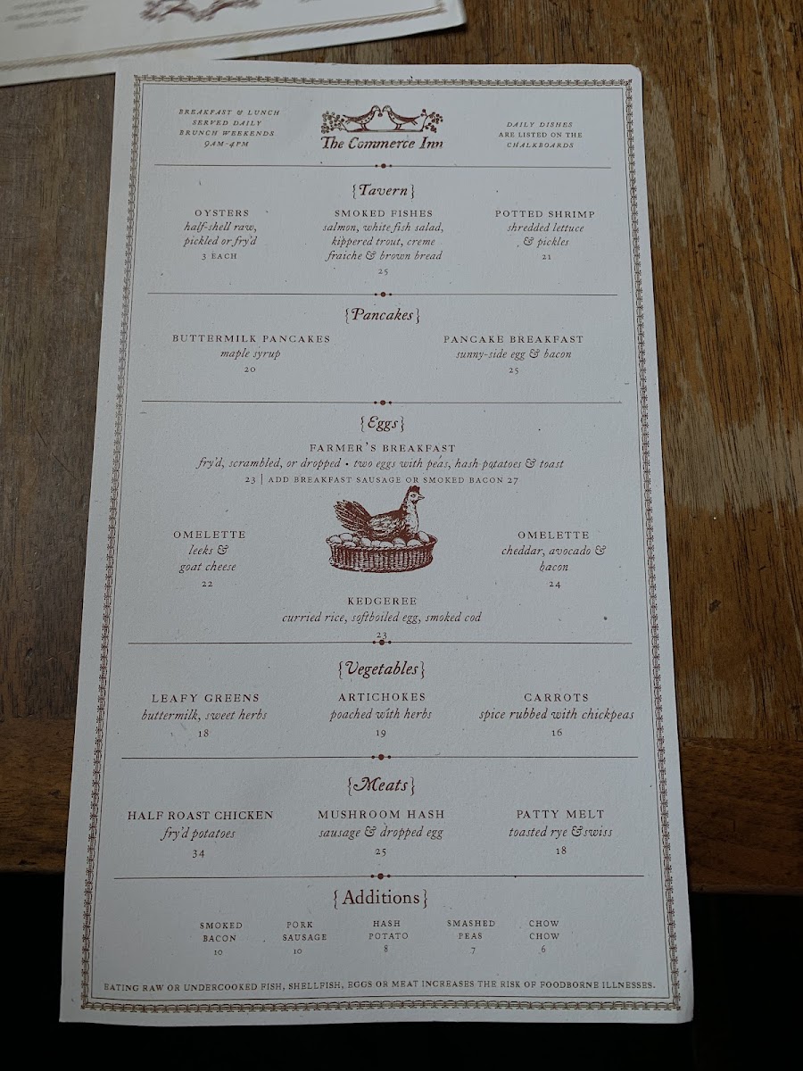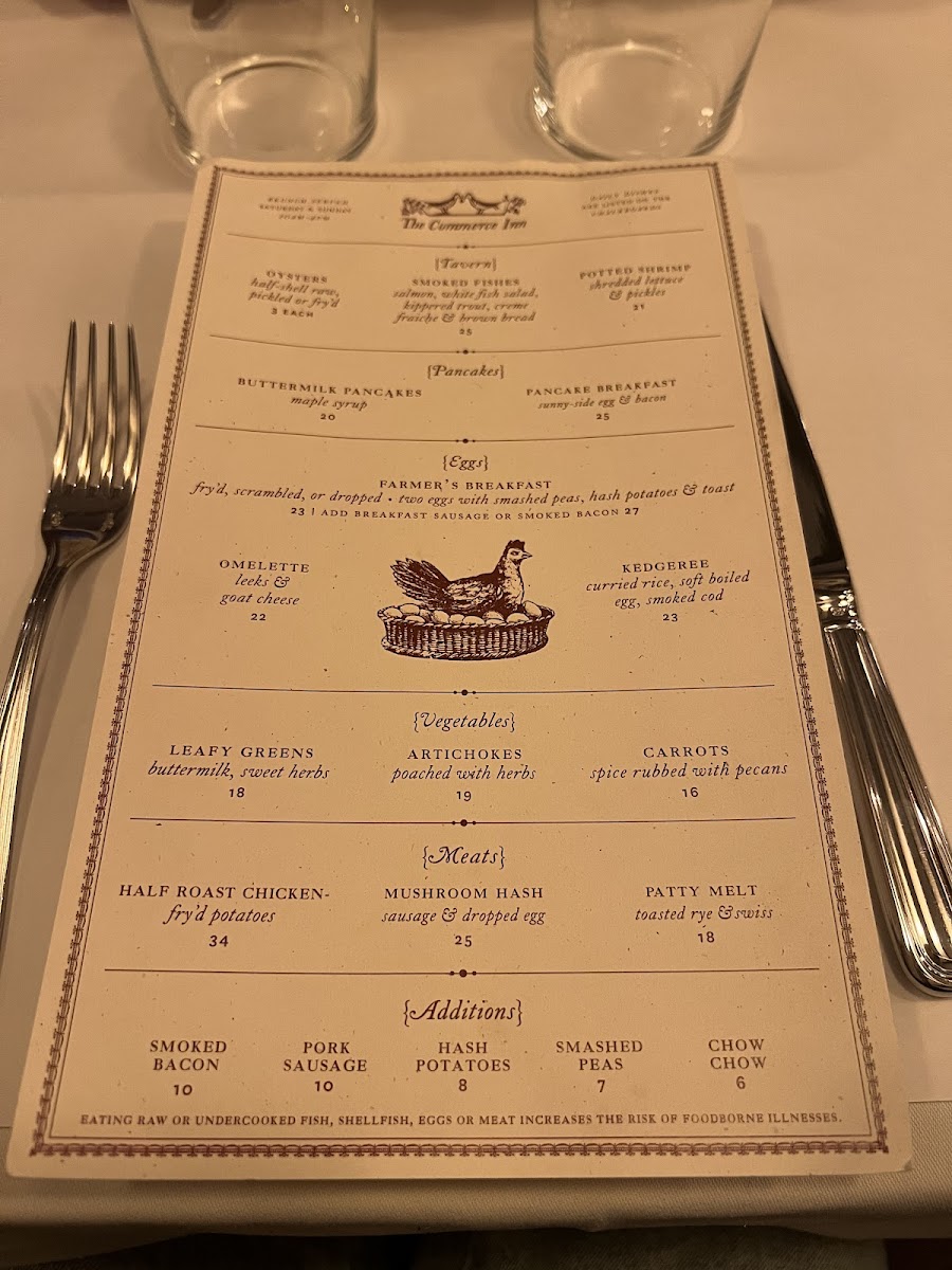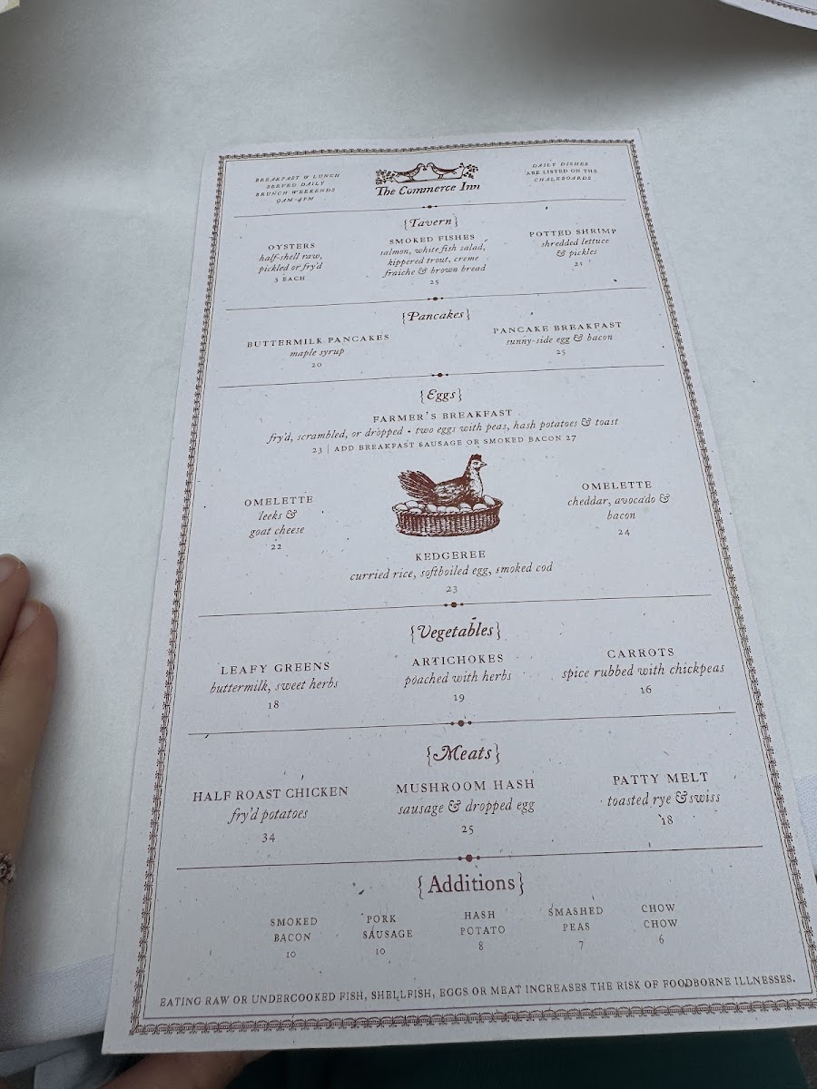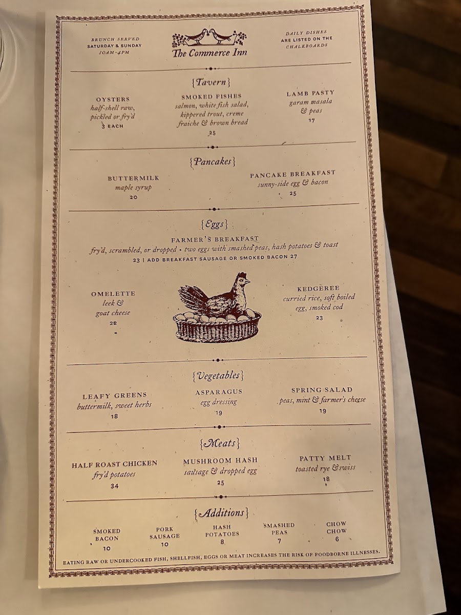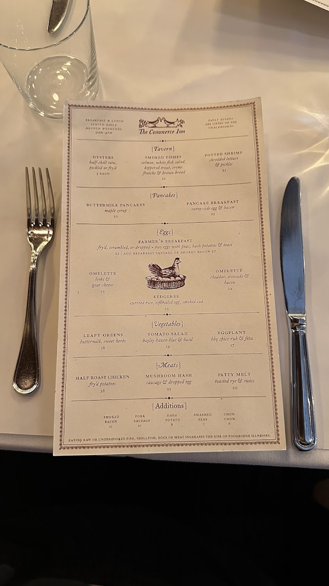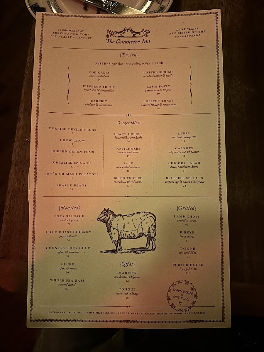 The menu at The Commerce Inn offers a delightful selection of hearty and flavorful dishes that showcase both rustic and refined techniques. For meat lovers, there is a variety of options to choose from, starting with the rich and savory Marrow, perfect for those seeking a bold, meaty flavor. Another standout is the Half Roast Chicken, a classic dish that offers a satisfying balance of tender, juicy meat and crispy skin. If you're in the mood for something with a bit more heft, the Country Pork Chop provides a wonderfully smoky and tender experience. Additionally, the Salt Beef offers a taste of traditional, salt-cured goodness, perfect for those who appreciate a touch of briny, savory flavor. For something truly comforting, the Oxtail Braised is an excellent choice, with the slow-cooked oxtail melting off the bone, packed with flavor and tenderness. Each dish is prepared with care and attention to detail, ensuring a satisfying dining experience for all guests. The menu at The Commerce Inn represents a perfect blend of classic comfort and culinary creativity.